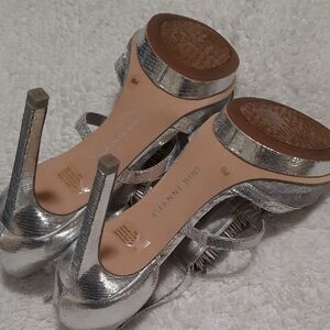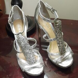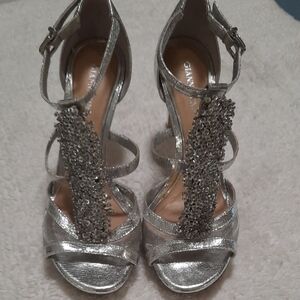 Dazzling silver heels with glitter accents. Strappy design for a chic look.