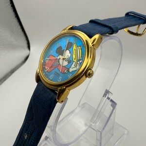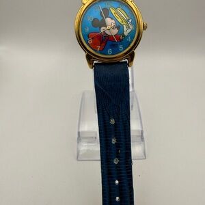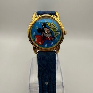 Disney Lorus Mickey Mouse Yellow Hat Watch Rare (New Battery) Blue Band Gold Bezel. Watch has minor scratches on crystal but works great! Back gold part of watch is a bit used. Please see pictures for more details.