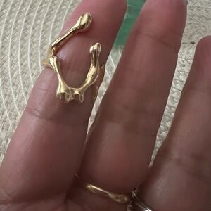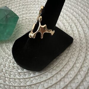 This modern gold ring adds a touch of sophistication to any outfit. Is handmade w what looks like a person n a dog. Use your own imagination w this piece.