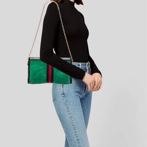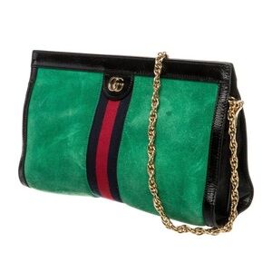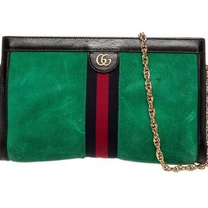 Chic Gucci clutch in green suede with black leather trim. Features a gold chain strap and signature logo detail.