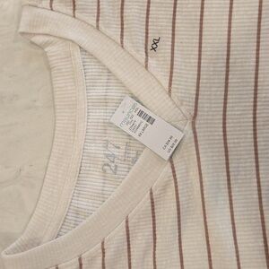 Elevate your casual wardrobe with this stylish striped V-neck top. Featuring a comfortable fit and long sleeves, it's perfect for any occasion. The cream and brown stripes add a touch of elegance to your look. New in the package
