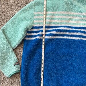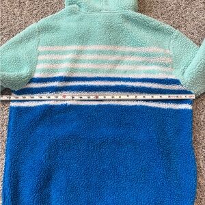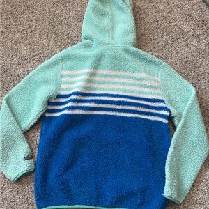 Soft sherpa hoodie with mint and gray design. Includes a cozy hood.