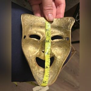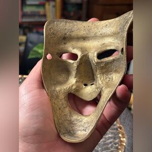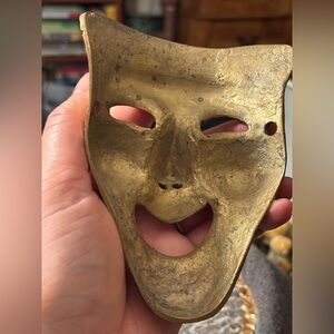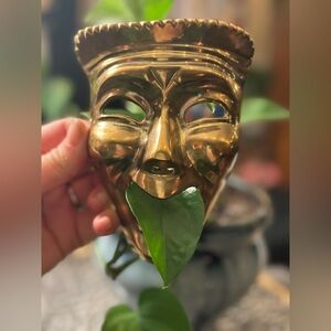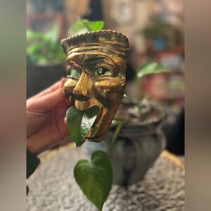 Striking vintage brass theatrical mask with expressive facial features and rich natural patina. This sculptural piece functions beautifully as wall art and as a creative vessel for living vine plants or decorative floral arrangements.
