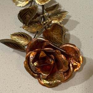 Vintage Mid-Century Modern Metal Rose Wall Sculpture, featuring stunning hand-crafted copper and brass details. This MCM floral art piece adds a touch of retro elegance to any room.