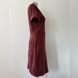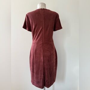 This 41 Hawthorn Bowie Faux Suede Knit Dress is a dark rusty burgundy color. It is made of a faux suede material, typically a blend of polyester and spandex, which offers a comfortable and stretchy fit.