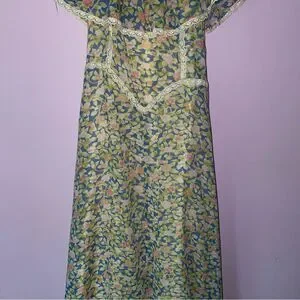 Vintage Dress S 1970s Maxi Ball Gown Blue Ditsy Floral Ruffle A Line