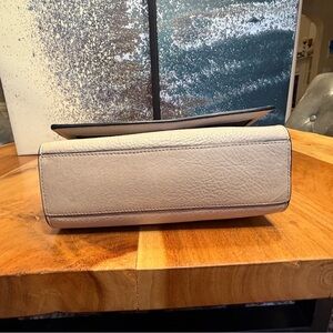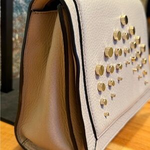 Elevate any outfit with this gorgeous, authentic Luana Italy handbag, crafted from premium pebbled leather in a chic, light beige/off-white (chalk) color. This statement piece features a unique, artfully arranged display of various metal studs across the front flap, adding a touch of playful glamour.
