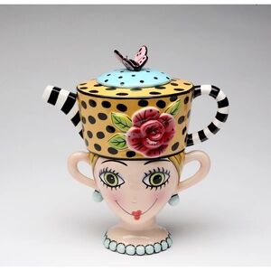 This whimsical ceramic teapot from Cosmos Gifts is a true statement piece, perfect for collectors or tea lovers with a flair for bold design. The teapot is crafted in the shape of a smiling lady’s face, adorned with a bright yellow and black polka dot hat topped with a sculpted pink butterfly and a 3D red rose. Elegant detailing includes striped spout and handle, mint green drop earrings, and a scalloped necklace base. The teapot lid is removable and serves as an integrated cup for a personal tea experience.