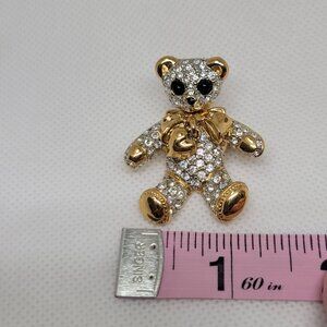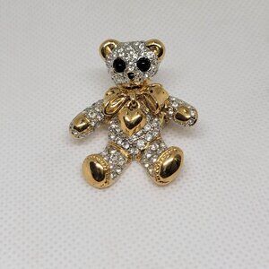 Vintage Teddy Bear Brooch Rhinestone Gold Tone Dangle Heart Bow Fashion Jewelry