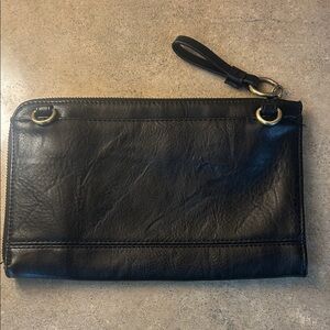 Chic black leather wristlet with stylish gold accents. Ideal for versatile use 10x5 could add a strap to it. Vegan joy, Susan.