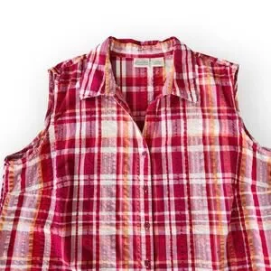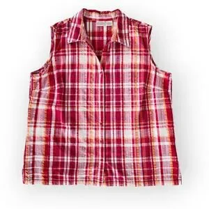 Y2K St Johns Bay Red Orange White Plaid Sleeveless Button Down Top Cotton 2X