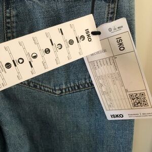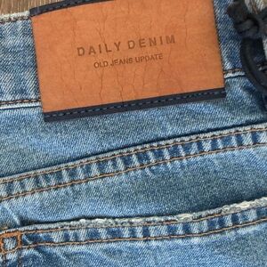 Upgrade your wardrobe with these high rise medium/light blue denim jeans in a 90’s throwback style. Perfect for any casual occasion, these jeans offer both style and comfort, and make the perfect addition to a capsule wardrobe. Classic 5-pocket styling, button fly, belt loops, cropped raw hem, high rise, "Daily Denim" leather logo tag on back waistband. New with tags. Doesn't have an American size, but the measurements (see below) compare to a classic size 28 (6). ISKO is a denim manufacturer that works with Adriano Goldschmied and various Japanese denim brands, using sustainable practices to make high quality, comfortable denim. This pair is from the 2020 “Old Jeans Update” line, for a modern spin on a classic pair of jeans.