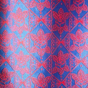 Blue and red floral geometric pattern jacquard woven dress that appears purple from afar.