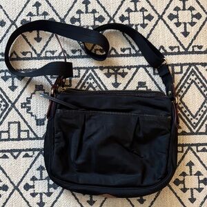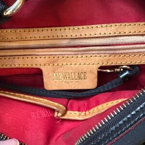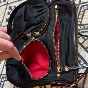 Sleek black crossbody bag by MZ Wallace with red interior and gold tone hardware. Features multiple pockets and adjustable strap. Clip for keys or cosmetic bag. Some interior spots. Several pockets for organizing. Ideal for everyday use.