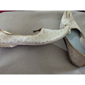 This product is a pair of traditional Indian juti shoes for men, specifically designed for a wedding or special occasion. The shoes are embroidered with intricate designs and are made of authentic Katha material in an ivory color. They offer comfort and are styled in a way that reflects Indian tradition and elegance. Perfect for completing a formal or traditional outfit, these shoes are a unique and stylish addition to any man's wardrobe.