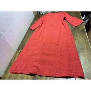 The Francesca Bettini Dress in size small is a vibrant red linen blend dress made in Italy. Featuring a 3/4 roll tab sleeve and a V-neckline, this boho-style dress is perfect for travel, casual outings, or workwear. The dress has a pullover closure and is adorned with button accents. With a long dress length and a shift, maxi style, this lightweight and collarless dress is ideal for the summer, fall, and spring seasons, making it a versatile and stylish addition to any woman's wardrobe.pre owned good condition we ship fast measurements are in the pictures