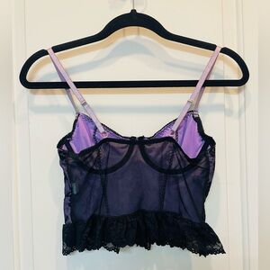 This elegant women's top features a beautiful black lace overlay on a rich purple base. Perfect for adding a touch of sophistication to any outfit.