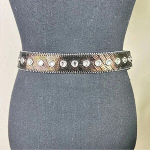 Black and copper animal print belt with silver tone beading across top and bottom in good condition. 1 stone missing on buckle- pls see all photos. Size: L Stamped genuine Italian Leather, but I believe it to be vegan. {Styled on a size 4 mannequin.}