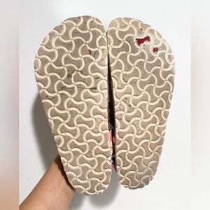 Experience comfort with Birkenstock's floral sandals. Navy and pink design. Perfect for casual wear. Equivalent to a women’s size 7