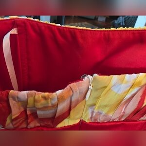 Chic strapless dress with bold floral design. Features vibrant red and yellow hues. Ideal for stylish outings.