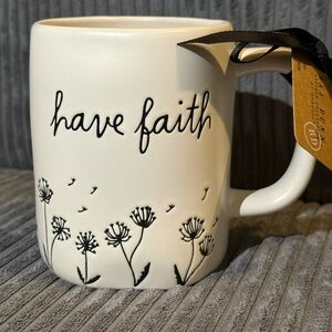 Charming Rae Dunn mug with a pink interior. Perfect for coffee or tea.