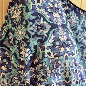 Elegant sleeveless top with matching bottom in intricate navy and teal design. Perfect for any occasion.
