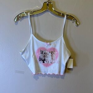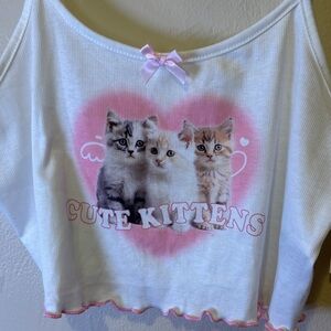 Adorable crop top with cute kitten print. Features spaghetti straps and a pink bow detail. Perfect for casual wear.