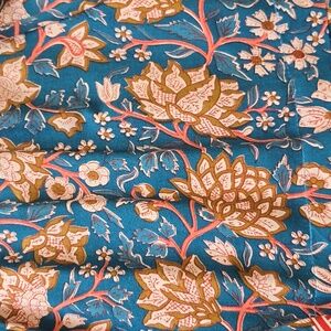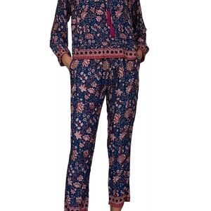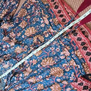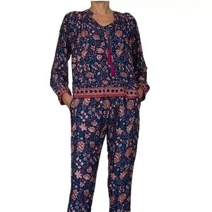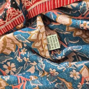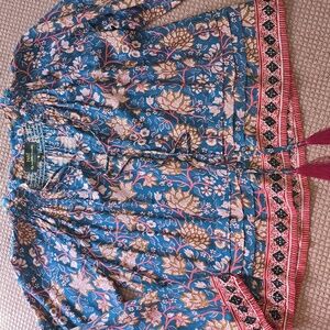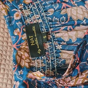 Nat by Natalie Martin Blue Floral Print Tassel Peasant Blouse. Allover print. Split neck with tassel ties and band collar. Long sleeves. Blue, pink, red hue. Rayon. Sold at Anthropologie.