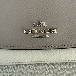 Chic Coach wallet in taupe and ivory. Sleek design with ample storage.