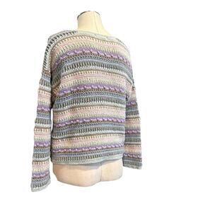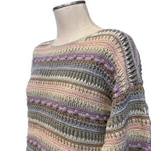 Vintage Cullinane crochet sweater in a ramie/cotton blend with multicolor pastel striping and textured bobble stitching. Cozy, boho, and perfect for cottagecore and craftcore styling. Tag says Large.