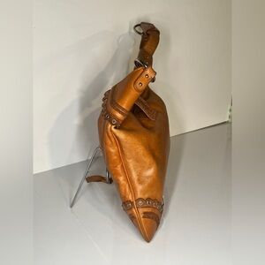 Camel leather with grommet detail shoulder bag from BCBGIRLS. Bag has magnetic flap closure. Measurements 14.5"W 9"H 1"D & 18" W/strap.
