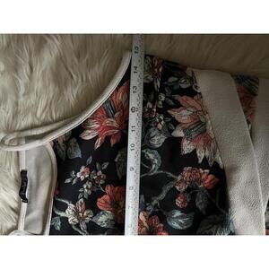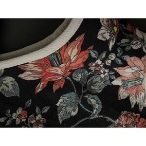 Floral crop top featuring a black base with vibrant floral print. White trim along the neckline, armholes, and hem adds contrast. Sleeveless design with a fitted silhouette. Perfect for casual summer wear or layering.