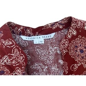 Veronica Beard NWOT dress in a rich burgundy floral print with intricate border detailing. This elegant piece features a flattering V-neckline, long sleeves with button cuffs, and a tiered skirt that adds graceful movement. The waist is cinched with a drawstring tie for a customizable fit, while the lightweight fabric makes it a versatile choice for transitional seasons. Perfect for pairing with boots or heels for a sophisticated bohemian look.