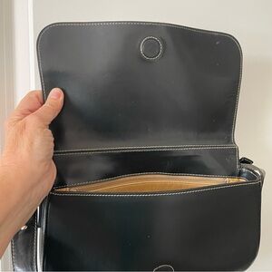 Luxurious black beauty! Dooney & Bourke top of the line Italian leather Full Flap purse from the Toiny collection, circa 2001. Measures appx. 10.5" x 6" x 2.5". Strap drop is appx. 9.5". Front flap has magnetic closure. One inside zip pocket. Outside has some scratches and some of the white stitching is missing from the front flap. This should be an easy fix with a needle and thread, or by a shoe repair shop. Inside has some dirt I did not try to clean. Unique double leather strap. From smoke-free home.