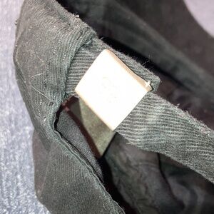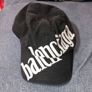 Chic black hat with striking white Balenciaga embroidery. Ideal for everyday style. Could use a lint roller on the hat.