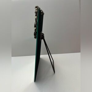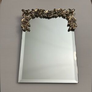 Beveled vanity mirror with metal stand Gold resin decorative floral top border.