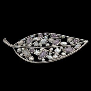 Elevate your style with this vintage Laila Rowe brooch. The large leaf shape, adorned with gunmetal black and rhinestones, adds a touch of elegance to any outfit. Perfect for collectors and fashion enthusiasts alike.