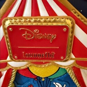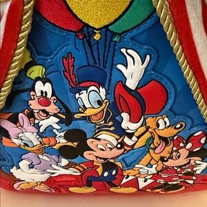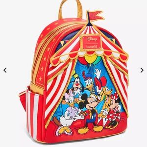 Loungefly Disney Mickey & friends Circus a box Lunch Exclusive Vibrant Loungefly backpack with Disney characters. Features red, blue, and yellow accents.