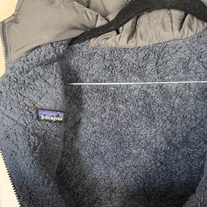 Warm vest with a plush hood. Ideal for outdoor adventures. Two sides in good condition