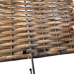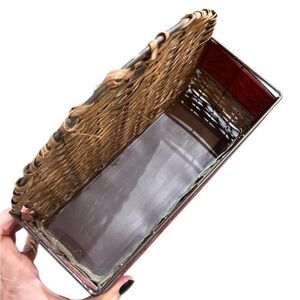 Wicker wall mounted basket featuring red metal decorative accents and hooks. Perfect for organizing keys, mail, hanging lightweight coats, etc. has a callout: one of the wicker sticks is broken. It is located in an inconspicuous area. Unbranded. Please see photos. 10” wide x 4” x 11” long.