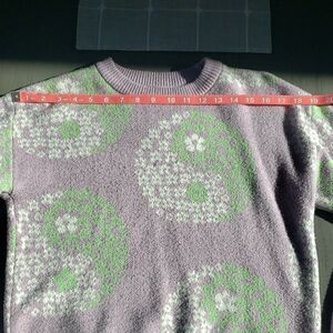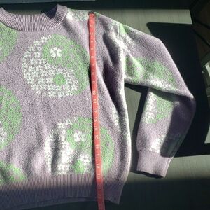 Elevate your style with this charming floral Yin Yang sweater. The delightful blend of lavender, green, and white adds a unique touch to your wardrobe.