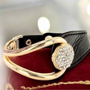 The high contrast is the first element that stops traffic. Rich, black, imitation leather is juxtaposed with a highly polished, gold-tone, half bangle. They are joined at the center with a white crystal station that dazzles and contrasts with both the gold tone and the leather-look elements of the piece.