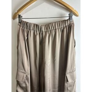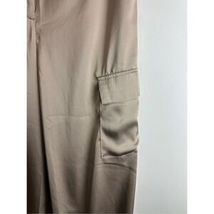 Satin cargo jogger pantsHigh waisted fit with a wide band at the top Elastic at the back Zip up, button, & clasp closure Pockets on either side at the waist & pockets on either side of the leg Jogger style fit with adjustable tie elastic at the ankle Model is wearing a size small 100%. polyester