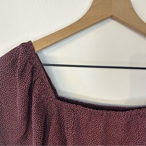 Abercrombie & Fitch Women’s Burgundy and White Polka Dot Top, Size Medium. This blouse has a fitted bodice with a stretchy back and loose peasant sleeves.