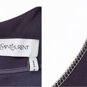 Stunning Yves Saint Laurent midi dress featuring signature silver-tone chain detailing along the cold-shoulder cutouts. This sleek, fitted silhouette hugs the body beautifully while maintaining a refined, modern edge. The chain trim adds a subtle statement without overpowering the minimalist design. Perfect for cocktail events, evening dinners, or elevated fall/winter styling.