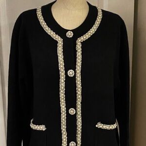 Brand new Chic black cardigan with elegant pearls and stones on buttons cream detailing. Features button closure and pocket accents. Perfect for versatile styling. p-p21.5”and 24” long