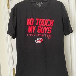 The shirt is a Pyotr Kochetkov: No Touch My Guys T-shirt, an officially licensed product for the Carolina Hurricanes NHL team. The design is based on the Russian goalie Pyotr Kochetkov's quote and is popular among Carolina hockey fans.