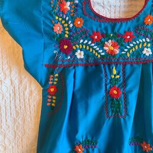 This charming kids casual dress features vibrant embroidery on a beautiful blue fabric. Perfect for any casual outing, it combines comfort with style.