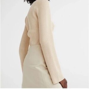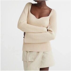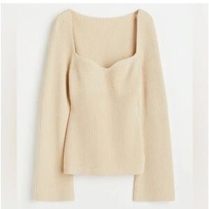 Rib-knit sweater Top in excellent new condition, Thick, warm rib knit Fitted top . Sweetheart neckline, long bell type sleeves opening, and a straight hem. Very Warm, great for this time of year m. Hangs nicely on the body as it can be worn as is, or off the shoulders. Beautiful sweater fits true to size, and is Compared to a well known very expensive brand.