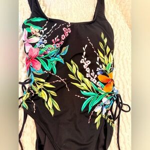 Laced up and ready to hit the beach or the street! The Vince Camuto Lace Up U-Neck One Piece Swimsuit features a colorful floral print, lace up sides, scoop back, high leg and removable soft cups.